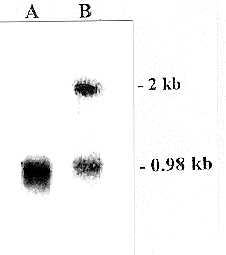 transformant RNA (lane B), while both wild type and transformant RNAs have a 0.98 kb transcript which