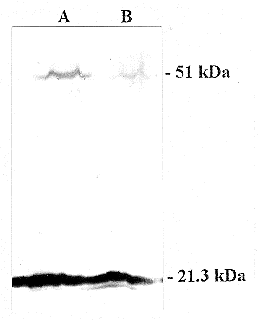 Figure 3. Western blot analysis of one mutant (lane B) compared with the wild type (lane A). The same