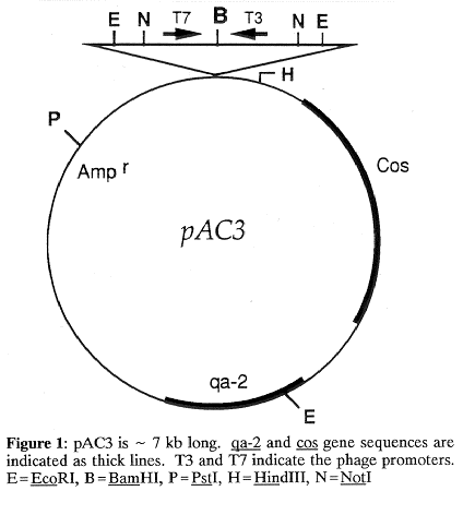 3) The presence of T3 and T7 phage promoters flanking the cloning site allows both the preparation of RNA probes representing the ends of the cosmids and restriction mapping using T3 and T7 DNA sequencing primers (Evans et al. 1989. Gene 79:9).
