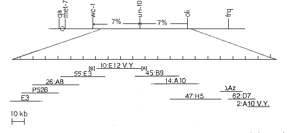 Fig. 2. Chromosome walking from un-10 toward wc-1 and oli. Part of the linkage groups VII map is shown on the top, the genetic distances in the region between wc-1 and oli are indicated. The inserts of the walking cosmids and lambda clone are shown as horizontal lines below the chromosome. The cosmids indicated with the symbol V.Y. are from the Vollmer-Yanofsky library, the others are from CBM1. Probes A and B, used to start the walks, are indicated by boxes. Cosmid 10:E12 was kindly provided by T. Schmidhauser. The clone Az was isolated from the lambda J1 library (M. Orbach) available from FGSC.