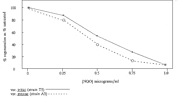 The ascomycete fungus Gaeumannomyces graminis is the causative agent of take-all disease of cereals. Much information about the physiology and pathology of this organism has been generated (Asher and Shipton (Eds.) "Biology and Control of Take-All", Academic Press, 1981), but genetic studies such as the production of mutants have been hindered by problems in obtaining viable propagules suitable for mutagenesis (Blanch et al. 1981. Trans. Brit. Mycol. Soc. 77:391-399). The fungus is homothallic but many strains cannot be induced to form perithecia in culture and even the fertile strains produce insufficient numbers of ascospores for use in mutagenesis. It is, however, possible to produce and regenerate large numbers of protoplasts and Rochefrette et al. (1979. Ann. Phytopath. 11:43-51) reported the mutagenesis of G. graminis protoplasts using nitrosoguanidine (NTG). Here we report the mutagenesis of protoplasts by 4-nitroquinolene oxide (NQO), reportedly a safer and more disposable mutagen than NTG (Bal et al. 1977. Mutat. Res. 56:153-156).