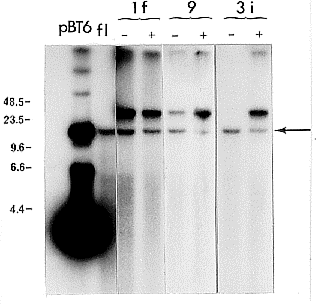 ClaI does not cut pBT6. In untransformed fluffy, pBT6 hybridized to a single ClaI DNA fragment of about 13 kb bearing the resident beta-tubulin gene (Fig. 1). In all genomic DNAs from the transformants, pBT6 hybridized to this band and to another ClaI fragment of higher molecular weight indicating that integration occurred by non-homologous recombination. However, the ClaI fragments bearing pBT6 sequences were shorter than the corresponding undigested DNAs, ruling out the presence of non-integrated circular oligomers of pBT6 (date not shown). In the absence of selective pressure, pBT6 sequences were maintained (transformant 1f) or lost (transformant 3i). In transformant 9, the intensity on the autoradiogram of the ClaI fragment bearing the pBT6 sequences is weaker after growth in the absence of selective pressure (Fig. 1). This suggests that some nuclei lost the pBT6 sequences, in agreement with the finding that only 7% of transformant 9 microconidia kept the transformed character under such growth conditions, as determined by genetic analysis.