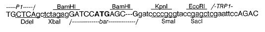 fragment carrying the bar gene are shown (internal sequences are omitted); the start codon is in bold type. The