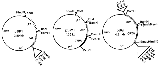 Several selectable genes have been reported for construction of filamentous fungal transformation vectors. Among the most widely used is the hygB (also known as hph) gene of E. coli, which is generally useful because the corresponding selective agent (hygromycin B) is toxic to wild type strains of many fungi and because scoring of transformants is usually unambiguous. We, and others (Avalos et al. 1989 Curr. Genet. 16:369-372), have found that the same merits are evident using bialaphos (or phosphinothricin) as a selective agent and the bar gene (DeBlock et al. 1987 EMBO J. 6:2513-2518), which encodes phosphinothricin acetyltransferase, as a selectable marker. We report here the construction of three vectors which carry bar as the selectable gene and have easily exchangeable parts as well as convenient cloning sites.