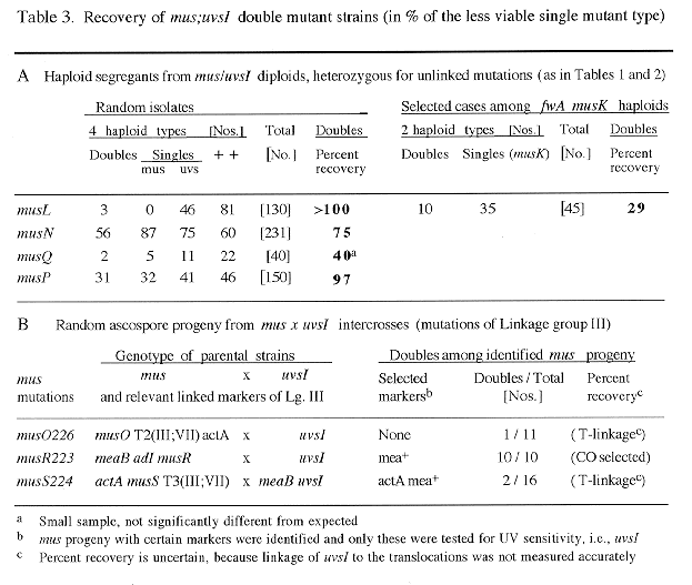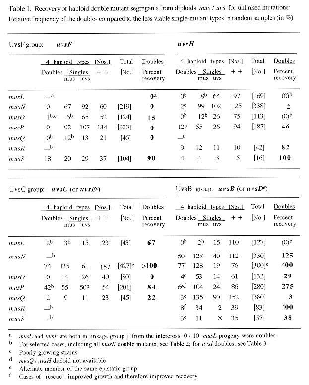 All types of isolated segregants are listed in Tables 1-3, and the recovery of double mutants is shown in percent relative to the "less viable" single mutant type. In general, only double mutants with good growth showed close to 100% recovery (e.g. mus;uvsI doubles), because of the competition between different segregant types on the benomyl plates during haploidization. "Lethal" interactions are assumed when practically no double mutants but significant numbers of both single mutant parents were obtained (e.g., in Table 1, for uvsF when combined with musN, or in Tables 1 and 2, for uvsF;musQ doubles). In random samples, certain musL and musO double mutants also could not be recovered, mainly because single mutants showed very poor recovery. However, when single mutants were selected, a significant fraction of doubles were obtained among them (compare results in Table 1 with those in Table 2).