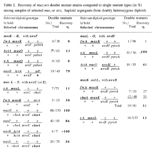 Lethal interactions between uvs mutations had been found previously appeared to be the rule for mutations of different epistatic groups in Aspergillus (Käfer and Mayor 1986 Mutat. Res.161:119-134). However, viable double mutants of uvsI with other uvs mutations have been identified recently, even for intergroup pairs (Chae and Käfer 1993 Curr. Genet 24:67-74) as also found here for the many cases of mus;uvsI doubles. The latter results resemble the findings for double rad mutants of budding yeast, which usually are viable in all combinations. Only a few "synthetic lethals" have been found for radiation-sensitive mutants of this species; e.g., for certain rad52 mutations, when combined with unusual alleles of the excision repair gene RAD3, or of the topoisomerase gene TOP1 (Montelone et al. 1988 Genetics 119:289-301; Levin et al. 1993 Genetics 133:799-814). However, for many other important mutants, interacting mutations which lead to enhanced effects and lethality have recently been reported, and selective systems have even been devised (Bender and Pringle 1991 Mol. Cell. Biol. 11:1295-1305).