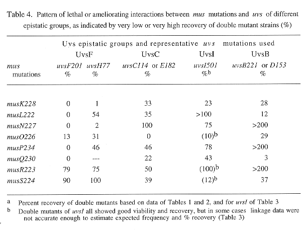The relative recoveries of double mutants from all the data are combined in Table 4. Clearly the majority of lethal interactions were found for mus mutations interacting with uvsF (5 of the 6 observed cases); only one other case is completely lethal (musO with uvsC). Unexpectedly, none of the mus;uvsH77 double mutants was completely lethal and only two showed very poor recovery, even though uvsH is a member of the UvsF epistatic group. In contrast, the two members of the UvsB group showed very similar results. Both uvsB and D affected viability of double mutants in all cases, but in two opposite ways for different mus mutations. Double mutants either were growing more poorly than uvsB (or D) singles and were produced with very low frequencies; or they showed better growth than uvsB (or D) and much increased recovery ( >200 - 400 % for musN, P and R double mutants).