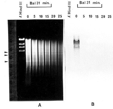 Panel A. A 0.7% agarose gel containing DNA digested with Bal31 for 0, 5, 10, 15, 20, and