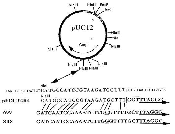 To help elucidate the mechanism by which these sequences were acquired by a transforming vector, DNA sequences adjacent to the telomere repeats from pFOLT4R4 and two strains of F. oxysporum were compared to each other and to pUC12 sequences at the site of the in vivo modification. The telomere ends of F. oxysporum f.sp. conglutinans (strain PHW808) and F. oxysporum f.sp. raphani (strain PHW699) were obtained by digestion of their DNA with Sau3A1, amplification of fragments containing the telomeres using anchored PCR (Roux and Dhanarajan, 1990, Biotechniques 8:48-57) primed with the anchor primer and a telomere primer (CCCTAACCCTAACCCTAA), and cloned into pCR1000 (Invitrogen Corp.). This technique produced many clones, but only a few contained the telomere repeats. The clones that did contain the telomere repeats also contained other Sau3A1 DNA fragments. Therefore to ensure no sequences were used which were not located next to the telomeres, only sequences between the telomere repeats and the first Sau3A1 site were compared. Telomere clones from F. oxysporum f.sp. lycopersici (strain 73) in which pFOLT4R4 had been formed, have not yet been obtained. Sequencing of the clones utilized the Sequenase DNA sequencing kit (USB). The results are shown in Figure 2.