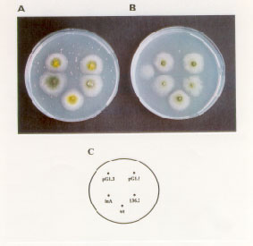 Figure 1. Growth tests of the transformants. Growth was monitored on appropriately supplemented minimal medium with 1% (w/v) D-glucose as carbon source and A) 3.3 mM of ammonium (as the (+)-tartrate) as nitrogen source in presence of 0.1 mg/ml of 2-thioxanthine and B) 0.1 mg/ml of uric acid as nitrogen source after 5 days at 25°C. C) Strains: wt: wild type for purine permeases, inA: uapA inactivated, 136.2: original transformant, pG1.3 and pG1.5: second generation transformants (uapAargB2 strain transformed with pG1).
