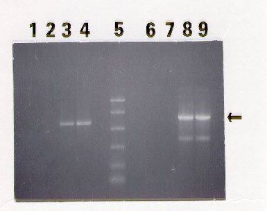Figure 3: Products of PCR amplifications performed with uapC specific oligonucleotides. Lanes 1 to 4: oligo 10 (5' ATTCAGGGTGGCGTCC 3') and 12 (5' GACCAGAGGAACCAGGC 3') were used. Lanes 6 to 9: oligo 17 (5' GGCAACGCAATGAAAGAC 3') and 20 (5' CCATTACAACGAGGAAGAAGC 3') were used. Lanes 1 and 6: no DNA was added to the reaction, lanes 2 and 7: pDHG25 was used as DNA template, lanes 3 and 8: pAN903 -the plasmid containing the previously cloned gene- was used as DNA template, lanes 4 and 9: pG1 -the rescued plasmid- was used as DNA template. About 10 ng of each plasmid were amplified by 35 cycles under the following conditions: denaturation for 1 min at 94°C, annealing for 1 min at 56°C and elongation for 1 min at 74°C using the Taq polymerase (Boehringer, Mannheim). The expected products of 591bp (oligos 10 and 12) and 611 bp (oligos 17 and 20) were obtained and run in a 1.5% agarose gel. Lane 5: PCR markers (Promega) was used, sizes of the fragments: 50, 150, 300, 500, 750 and 1000 bp. The uapC sequence had been previously submitted to the GenBank with accesssion number X79796.