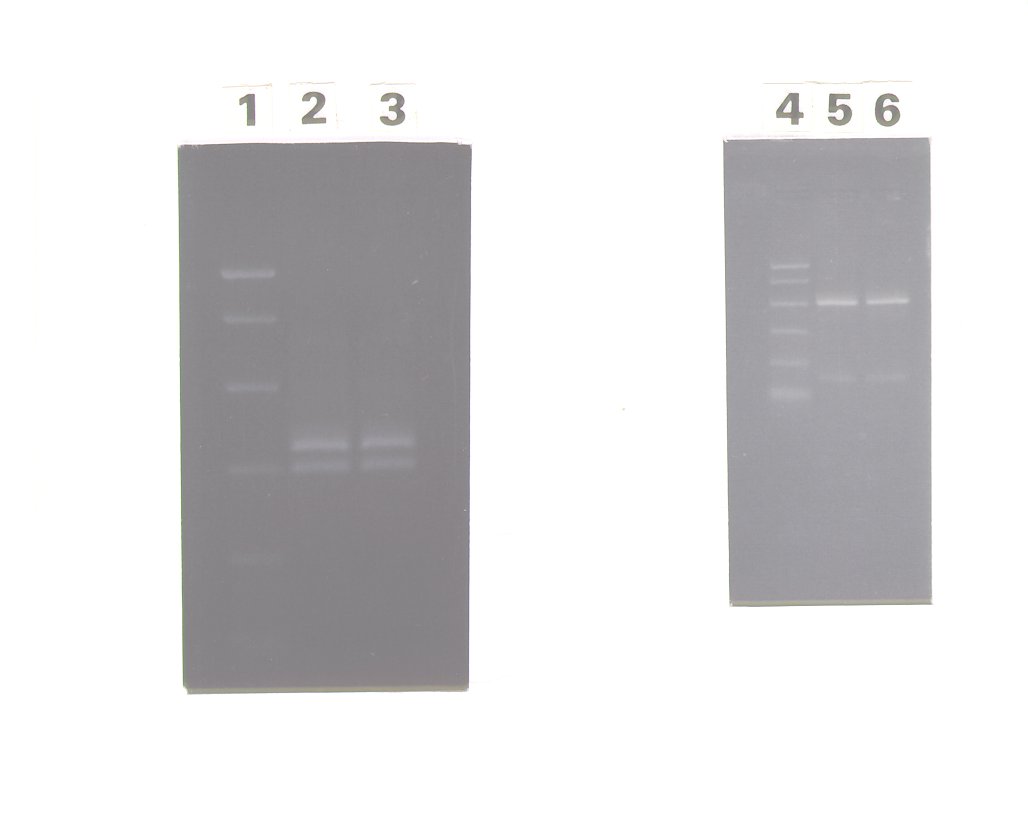 Figure 4: Restriction enzyme digestion of the PCR products. Lanes 2 and 3: Hpa I digestion of the 611 bp DNA fragment amplified with oligos 17 and 20. The expected fragments of 318 and 293 bp are obtained. Lanes 5 and 6: Ava I digestion of the 591 bp DNA fragment amplified with oligos 10 and 12. The expected fragments of 490 and 101 pb can be observed. Lanes 1 and 4: PCR marker.