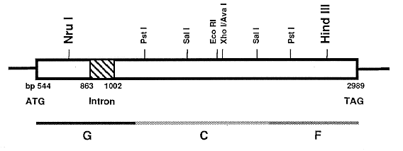 contains an intron. Six-base-pair restriction enzyme recognition sites are shown; large bold letters indicate