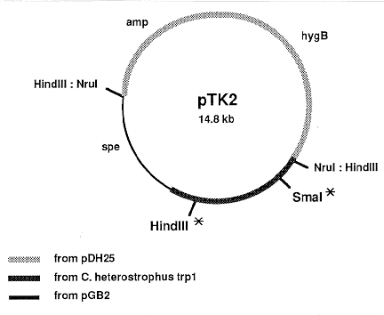 Sequence and restriction enzyme site data were used to construct pTK2 (Figure 2), a vector designed for introduction of a point mutation into TRP1. It is based on plasmid pGB2 (Churchward et al. 1984 Gene 31:165), which has no homology to pBR322 and can be used when interaction with pBR322-based vectors is to be avoided. pGB2 was digested with SmaI and a 3.8 kb BamHI-PvuII fragment containing TRP1 from pChTrp24B (Turgeon et al.1986 Gene 42:79-88) was inserted, eliminating the SmaI site. The new plasmid, pETE3, was digested with NruI, which cuts once in the coding region (bp 734, in the G domain) of TRP1; SmaI linkers were added and the plasmid religated. Insertion of linkers into the NruI site introduced a frame-shift mutation, which was confirmed by restriction mapping and sequence analysis. This plasmid, pTKG, was then partially digested with HindIII and end-filled. Restriction anayisis identified a plasmid, pTKGF, which contained a mutation in the HindIII site at the 3' end of the coding region (bp 2653) of TRP1 (Fig. 2). pTKGF was digested with HindIII, blunt-ended and ligated to NruI digested pDH25 (Cullen et al.1987 Gene 57:21-26). The final construction, pTK2, contained the hygromycin B phosphotransferase gene from Escherichia coli with 5' and 3' regulatory sequences from A. nidulans trpC and the C. heterostrophus trp1 gene with frame shift mutations in the 5' and 3' regions of the ORF.