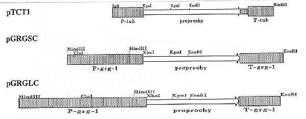 Figure 1. Neurospora crassa expression vectors TCT1, pGRGSC, and pGRGLC. Steps in the construction of the chymosin expression plasmids are described in the text. Presented are the expression cassettes for each plasmid. Stippled boxes represent the respective promoter and terminator sequences (beta-tubulin or grg-1). Open arrow represents preprochymosin sequences.
