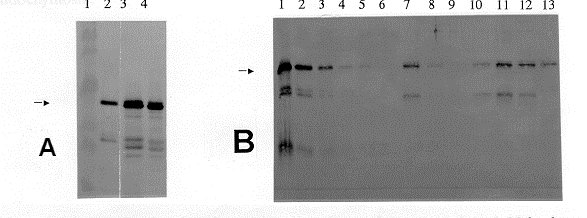 Figure 2. Western transfer of medium from various N. crassa transformants. A. Lane 1. Molecular weight markers. Phosphorylase B, 106 kD; Bovine serum albumin 80 kD; Ovalbumin 49.5 kD; Carbonic anhydrase 32.5 kD; Soybean trypsin inhibitor 27.5 kD; Lysozyme 18.5 kD. Lane 2. 100 ng authentic bovine chymosin standard. Lane 3. Concentrated medium (equivalent to 210 l of unconcentrated medium) from a pTCT1 transformant. B. Lanes 1-5: authentic bovine chymosin standards, 100 ng, 33.3 ng, 11.1 ng, 3.7 ng, 1.2 ng, respectively. Lanes 6-13: 12 l medium from individual transformants. Lanes 6-10: pGRGSC