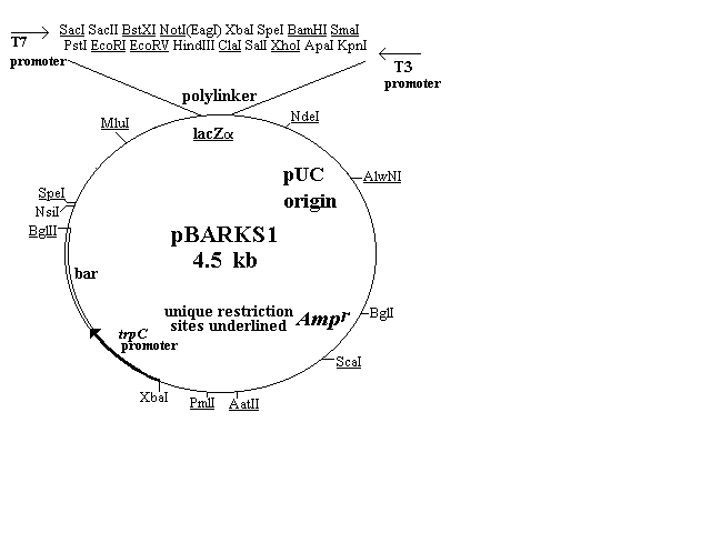 The first four of the vectors are shown in Figure 1 and described in the text. Three of them (pBARGEM5-1, pBARGEM7-1, and pBARKS1) are each about 4.5 kb and all four carry the bar gene under control of the Aspergillus nidulans trpC promoter. The polylinkers from the pGEM and Bluescript vectors are shown at the top of each restriction map, with the four to eight sites that are unique in each construct underlined.