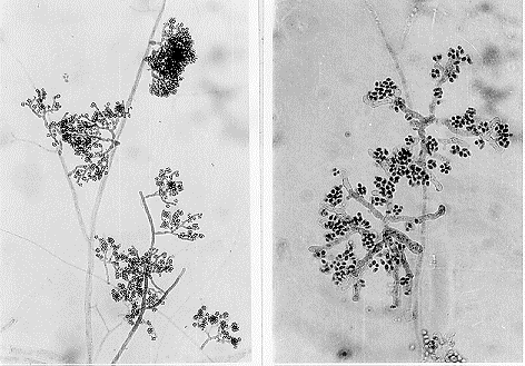 medium after 10 days growth. Right: Enlarged view of branched microconidiophores