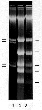Lane 2-3: Nucleic acid preparations from Aspergillus niger No. 1003. Molecular weights