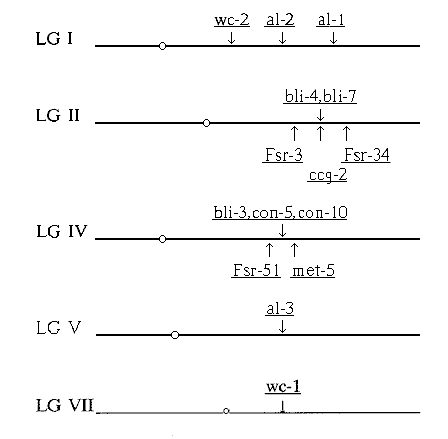 Figure 1. Schematic representation of the linkage groups of N. crassa. Only the relevant linkage groups are shown. Drawn