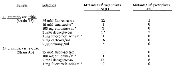 The ascomycete fungus Gaeumannomyces graminis is the causative agent of take-all disease of cereals. Much information about the physiology and pathology of this organism has been generated (Asher and Shipton (Eds.) "Biology and Control of Take-All", Academic Press, 1981), but genetic studies such as the production of mutants have been hindered by problems in obtaining viable propagules suitable for mutagenesis (Blanch et al. 1981. Trans. Brit. Mycol. Soc. 77:391-399). The fungus is homothallic but many strains cannot be induced to form perithecia in culture and even the fertile strains produce insufficient numbers of ascospores for use in mutagenesis. It is, however, possible to produce and regenerate large numbers of protoplasts and Rochefrette et al. (1979. Ann. Phytopath. 11:43-51) reported the mutagenesis of G. graminis protoplasts using nitrosoguanidine (NTG). Here we report the mutagenesis of protoplasts by 4-nitroquinolene oxide (NQO), reportedly a safer and more disposable mutagen than NTG (Bal et al. 1977. Mutat. Res. 56:153-156).