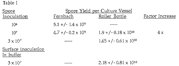 Table 1 indicates typical spore yields from Fernbachs and RBTLs inoculated with