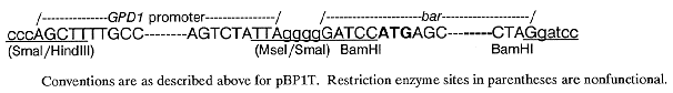 The third plasmid (pBG) was made by inserting the 575 bp BamHI bar fragment into the BamHI site in the polylinker of the Bluescript vector pIIKS+. A 675 bp HindIII-MseI fragment bearing the promoter of the C. heterostrophus GPD1 gene (VanWert and Yoder 1992 Curr. Genet. in press), was end-filled and inserted into the SmaI site of pIIKS+, just 5' of the bar gene, thus creating a GPD1 promoter::bar transcriptional fusion (Fig. 1). A combination of sequencing and restriction enzyme analysis confirmed the junction regions as shown below.