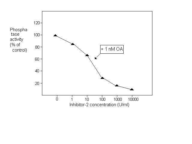 Figure 2. Inhibition of phosphorylase phosphatase activity by inhibitor-2 in the presence of okadaic acid (OA)