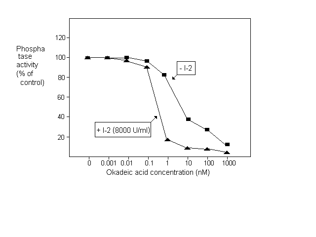Figure 1. Inhibition of phosphorylase phosphatase activity by okadaic acid in the presence and absence of inhibitor-2 (I-2)