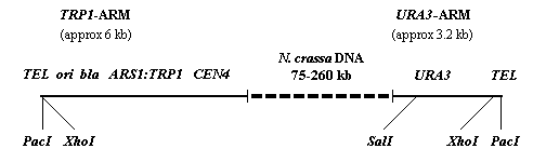 Figure 1. A schematic of a typical clone from the N. crassa YAC library is shown. The markers shown are described in the text.
