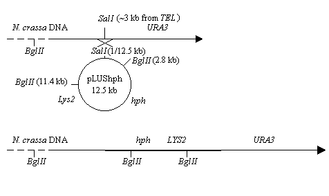 To facilitate introduction of any YAC clone in the library into N. crassa a yeast integration vector carrying a dominant N. crassa selectable marker was constructed. The plasmid pLUShph (diagrammed in figure 2A) encodes the hygromycin phosphotransferase gene (hph) under the control of a modified cpc-1 regulatory region (Royer and Yamashiro 1992. Fungal Genetics Newsl. 39:76-79). This plasmid (pLUShph) also contains the yeast LYS2 gene, and an E. coli KanR gene and ori. This plasmid was constructed by inserting the 3.0 kb HindIII fragment from pMP6 into the unique HindIII site on pLUS (Hermanson et al 1991. Nucl. Acids Res. 18:4943-4948).