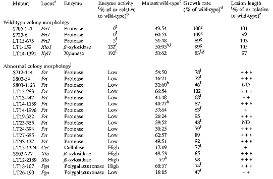 e Conidia from two mutant progeny were sprayed on corn plants and placed at 100% relative humidity overnight. After 4 days in the greenhouse, lesions were assessed. In cases where the lesions were measured, lengths are recorded here as average lesion size of the two progeny as a percent of wild-type. Lesion lengths of the two mutant progeny were not significantly different from wild- type, B30.A3.R.85. In other cases, lesion sizes were visually compared to those produced by wild-type (+++ = wild-type (~5-6 mm); ++ = ~3-4 mm; + = ~1-2 mm; ND = not determined because strains produce few conidia).