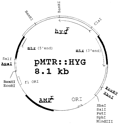 Figure 1. pMTR:HYG, a plasmid designed to differentiate between transformants arising through homologous recombination events and those arising through ectopic integration events, was constructed by inserting the hygromycin B resistance gene (designated hygr) into the coding sequence of the Neurospora crassa mtr gene, disrupting the mtr function. Known unique sites are underlined. Apparent coding sequences of mtr and AMPr are filled in.