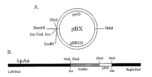 To construct lambdapAn we first constructed the plasmid vector pBX (Fig. 1A). To simplify the description of the construction of pBX we will only describe the source and structure of the DNA fragments used in its construction. pBX contains 2064bp of pBR322 from Ndel to EcoRI, an approximately 295bp EcoRI, BamHI fragment containing lox sites flanikng a NotI site from the plasmid pSE 1086(delta)NdeI (a gift from S. Elledge) and a 1565bp XhoI, NdeI fragment containing the pyrG gene from A. nidulans.